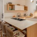 Spanning 300 square meters, its airy interiors emphasize open-plan living and natural materials. The spacious living and dining areas flow into a fully equipped kitchen, creating a warm, social hub for shared meals and conversation.