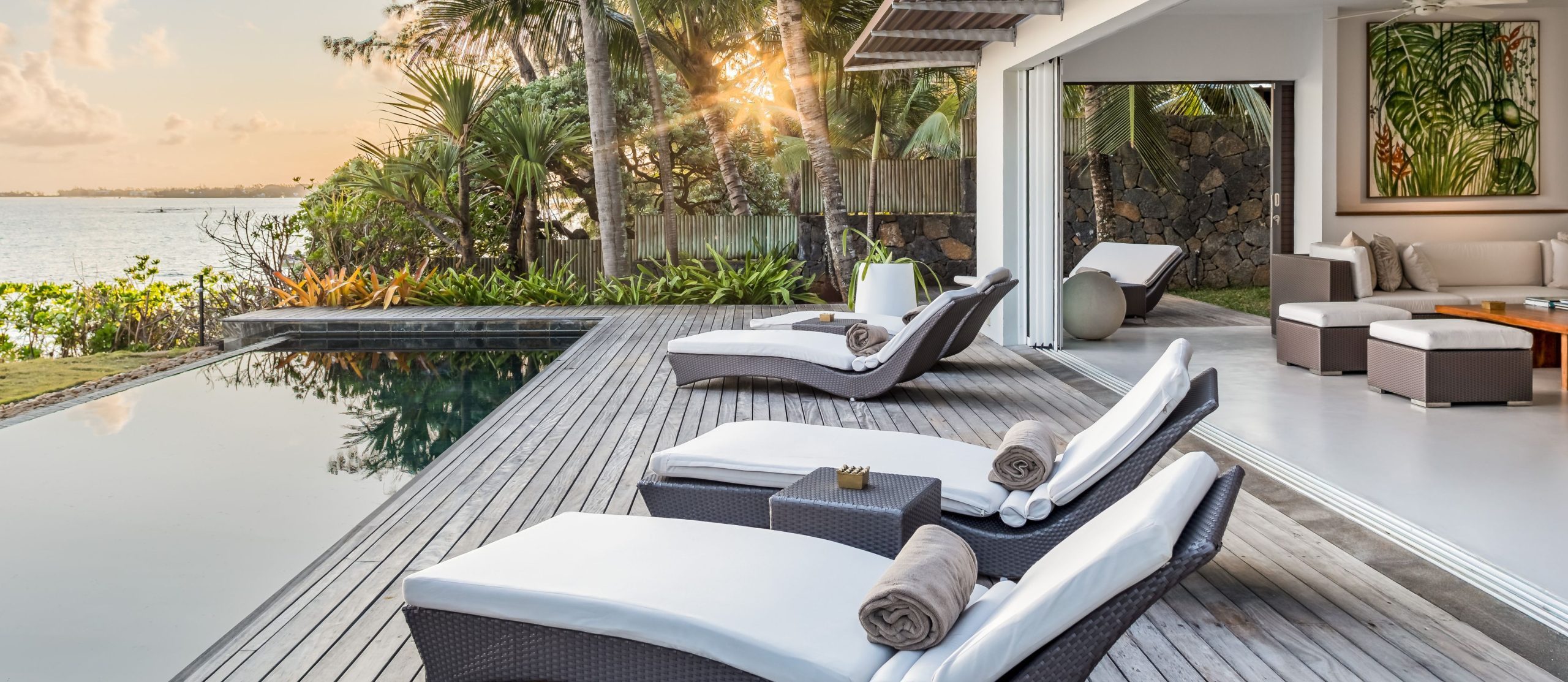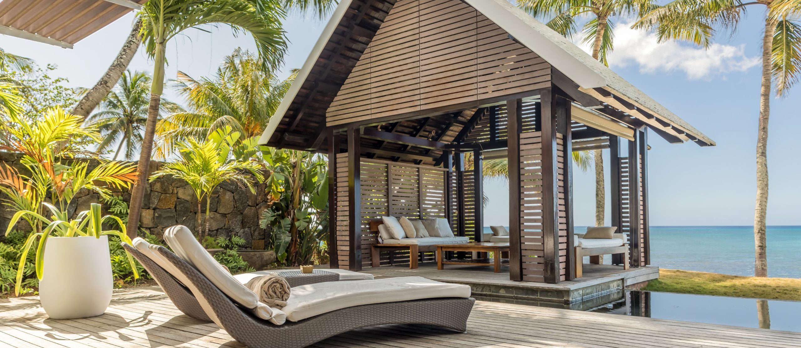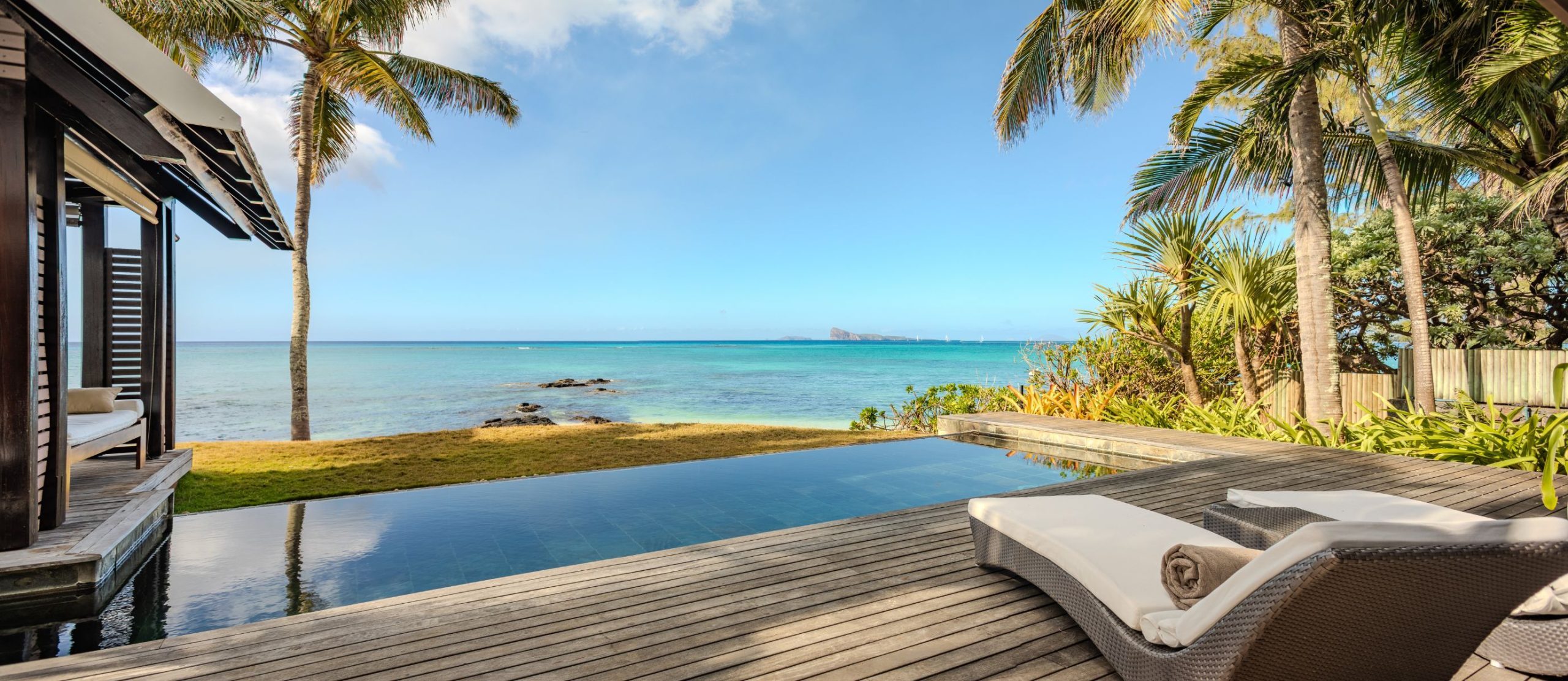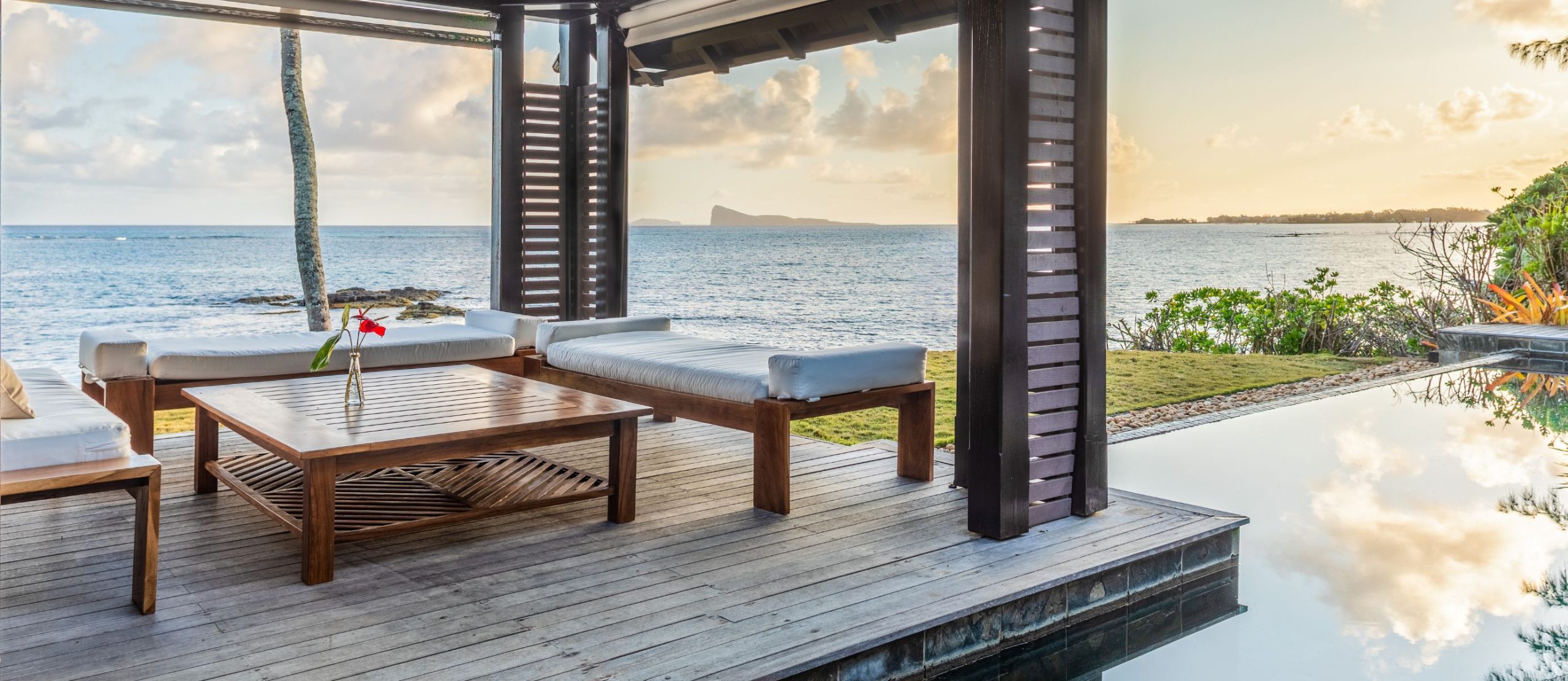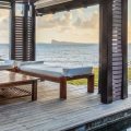 Step out onto the villa’s terrace, where the shimmering turquoise waters of the Indian Ocean stretch endlessly before you. The white sands of Pointe aux Canonniers Beach are just steps away, while the infinity pool mirrors the hues of the sea offers a secluded spot to soak up the tropical serenity. The villa’s open-air pavilion, built with warm wooden tones, is the perfect setting for morning coffee with a sea breeze or sunset cocktails under a sky ablaze with colour.