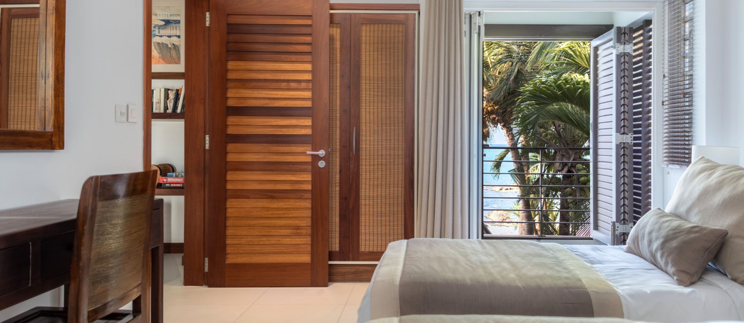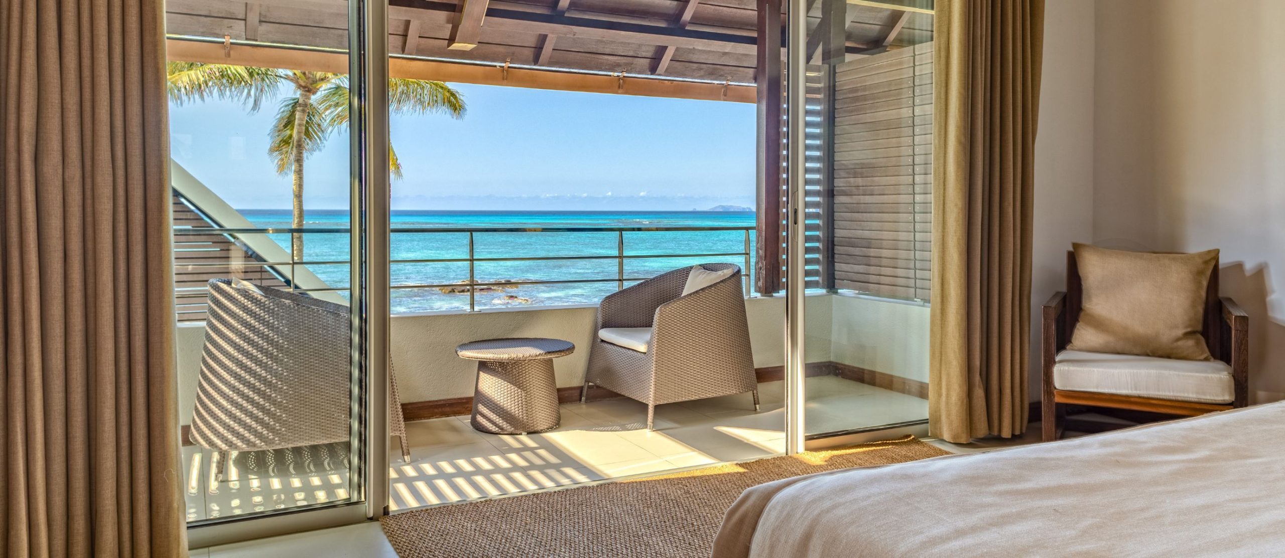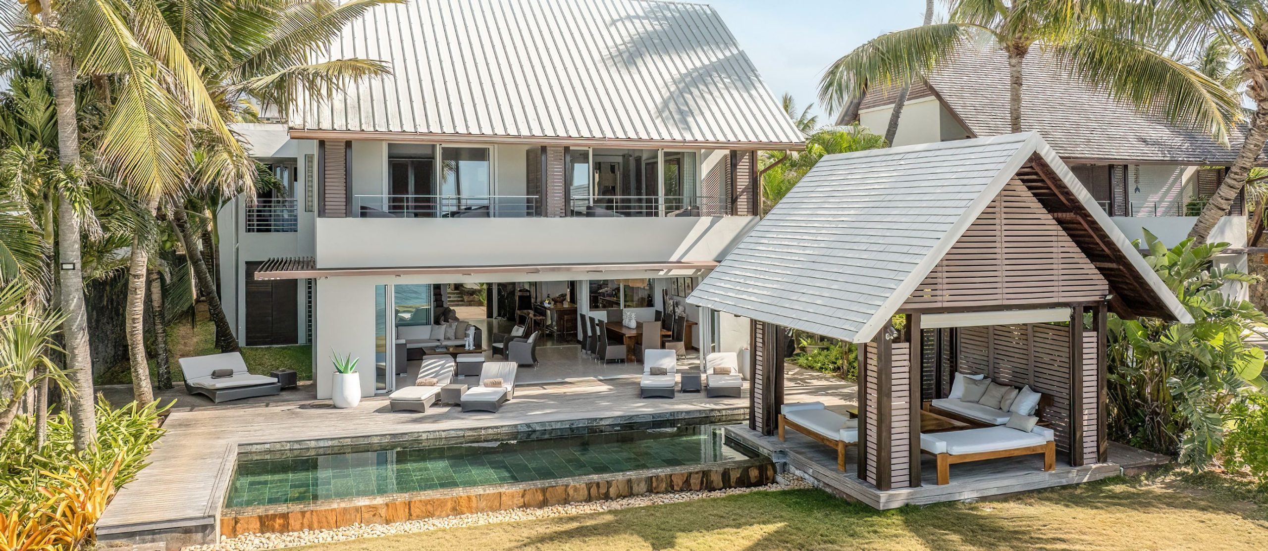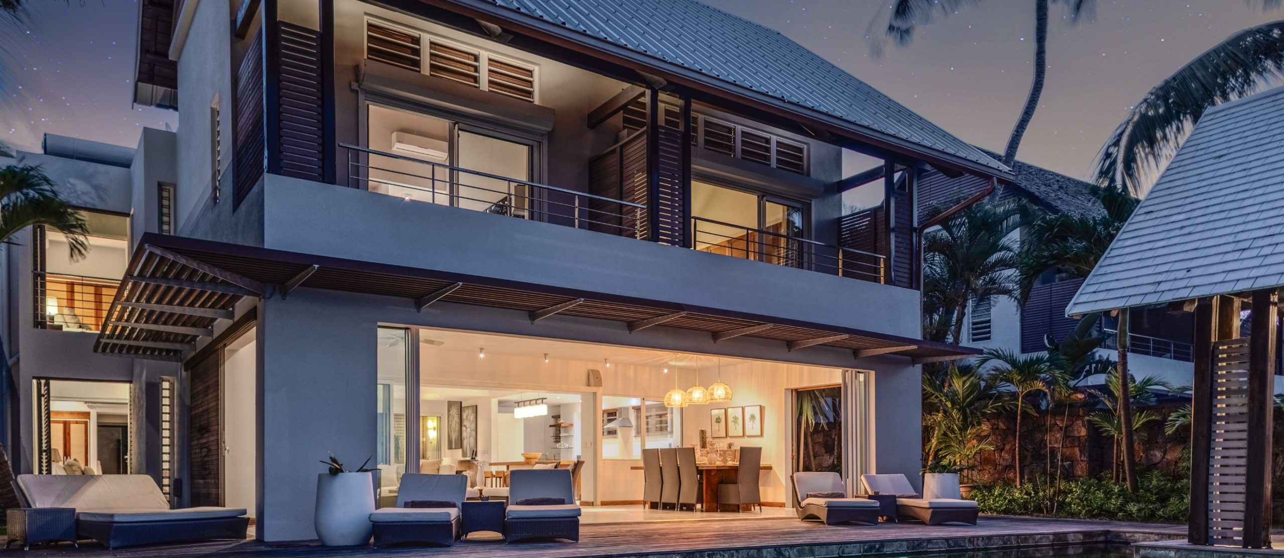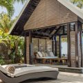 Step out onto the villa’s terrace, where the shimmering turquoise waters of the Indian Ocean stretch endlessly before you. The white sands of Pointe aux Canonniers Beach are just steps away, while the infinity pool mirrors the hues of the sea offers a secluded spot to soak up the tropical serenity. The villa’s open-air pavilion, built with warm wooden tones, is the perfect setting for morning coffee with a sea breeze or sunset cocktails under a sky ablaze with colour.