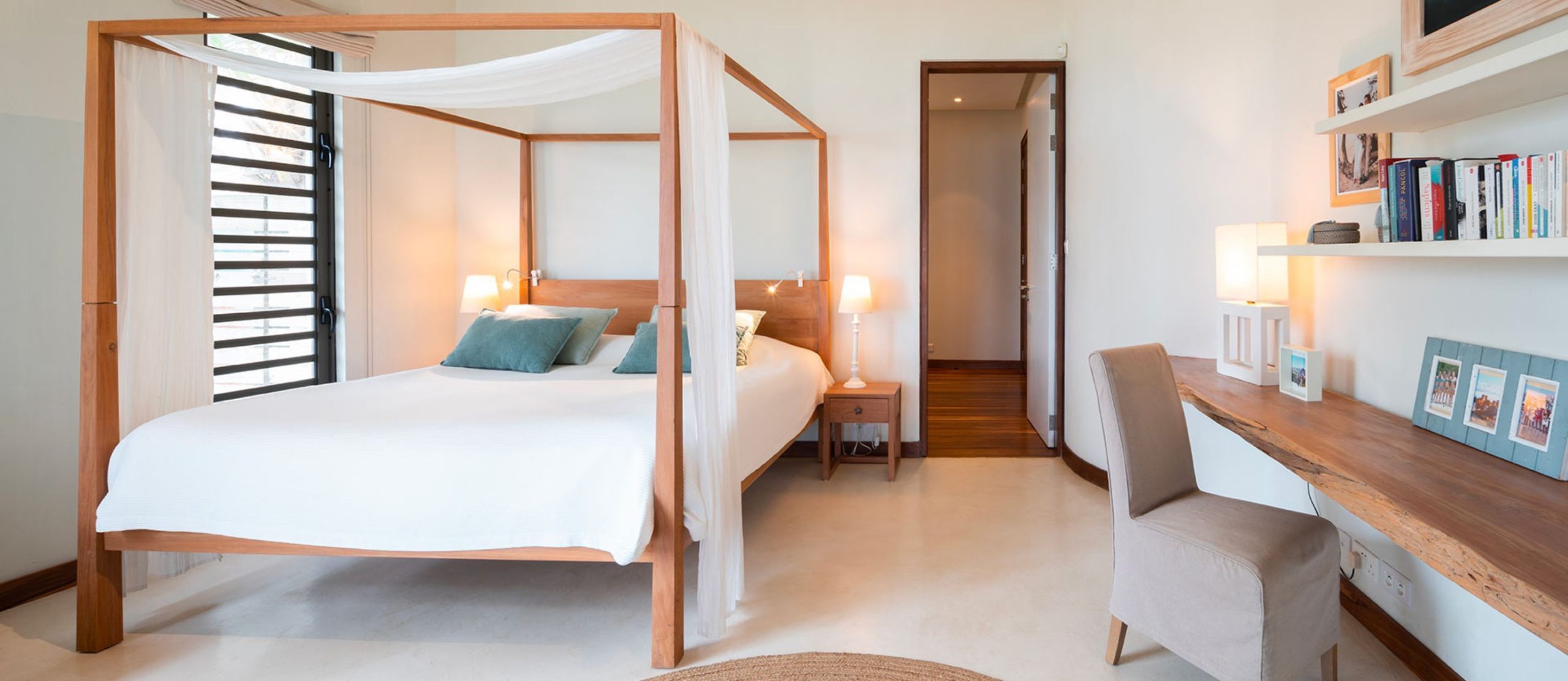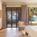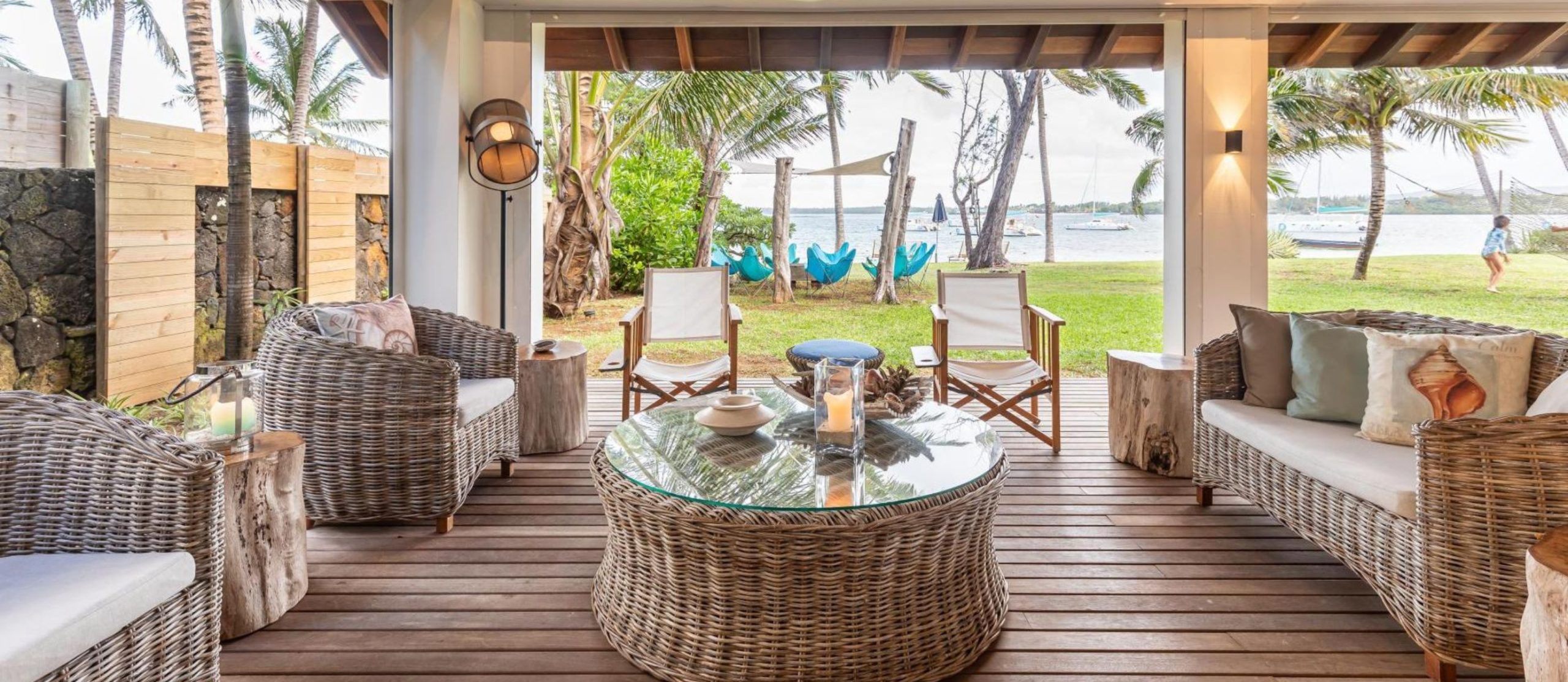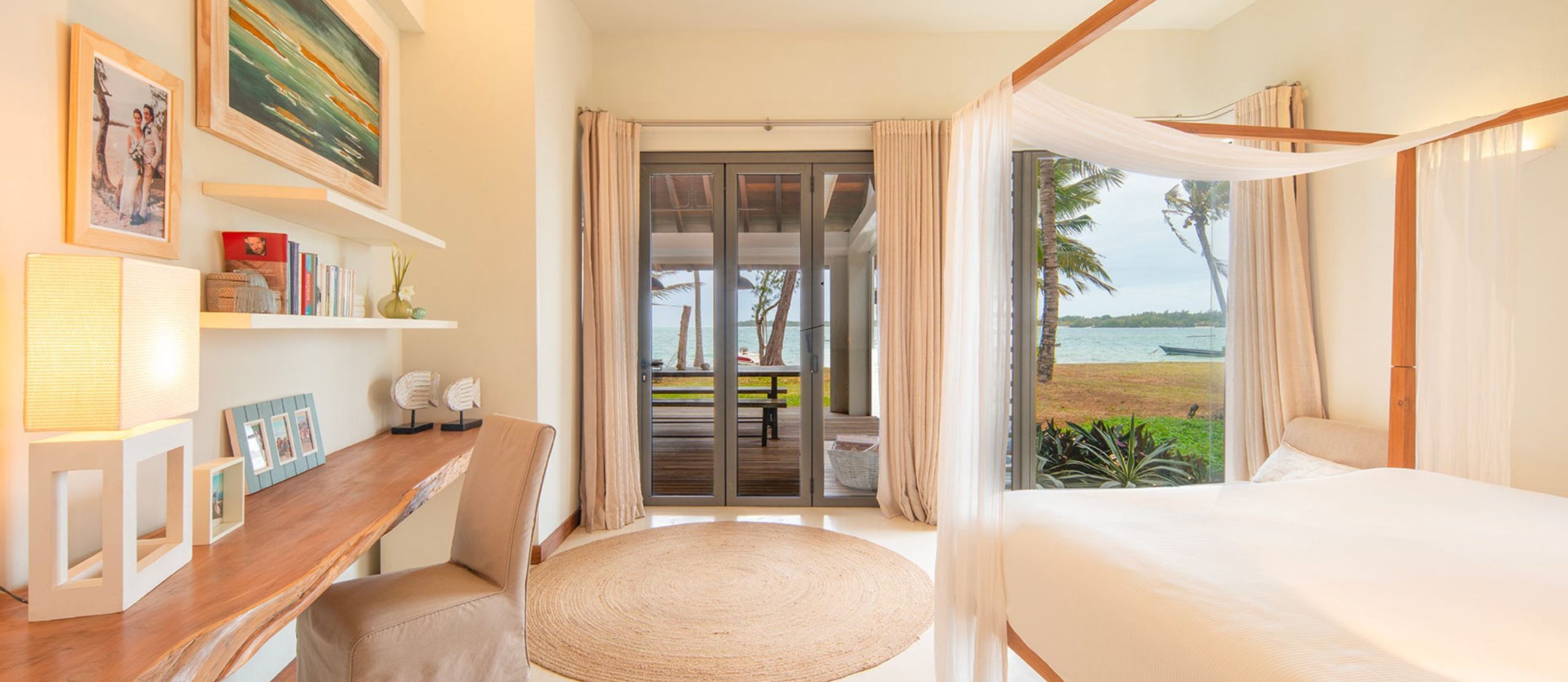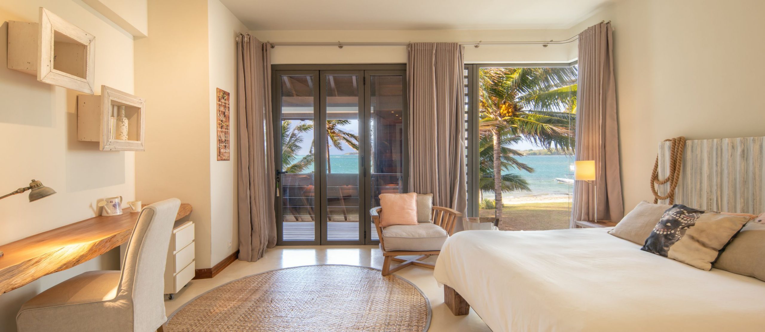 But it’s the villa’s seaside location that truly sets it apart. Step outside and you’re greeted with sweeping views of the shimmering turquoise lagoon and the enchanting island of Île aux Mangénie just across the water. Whether you’re enjoying a lazy breakfast on the terrace or an evening dip under a sky filled with stars, the sense of peace here is palpable.
