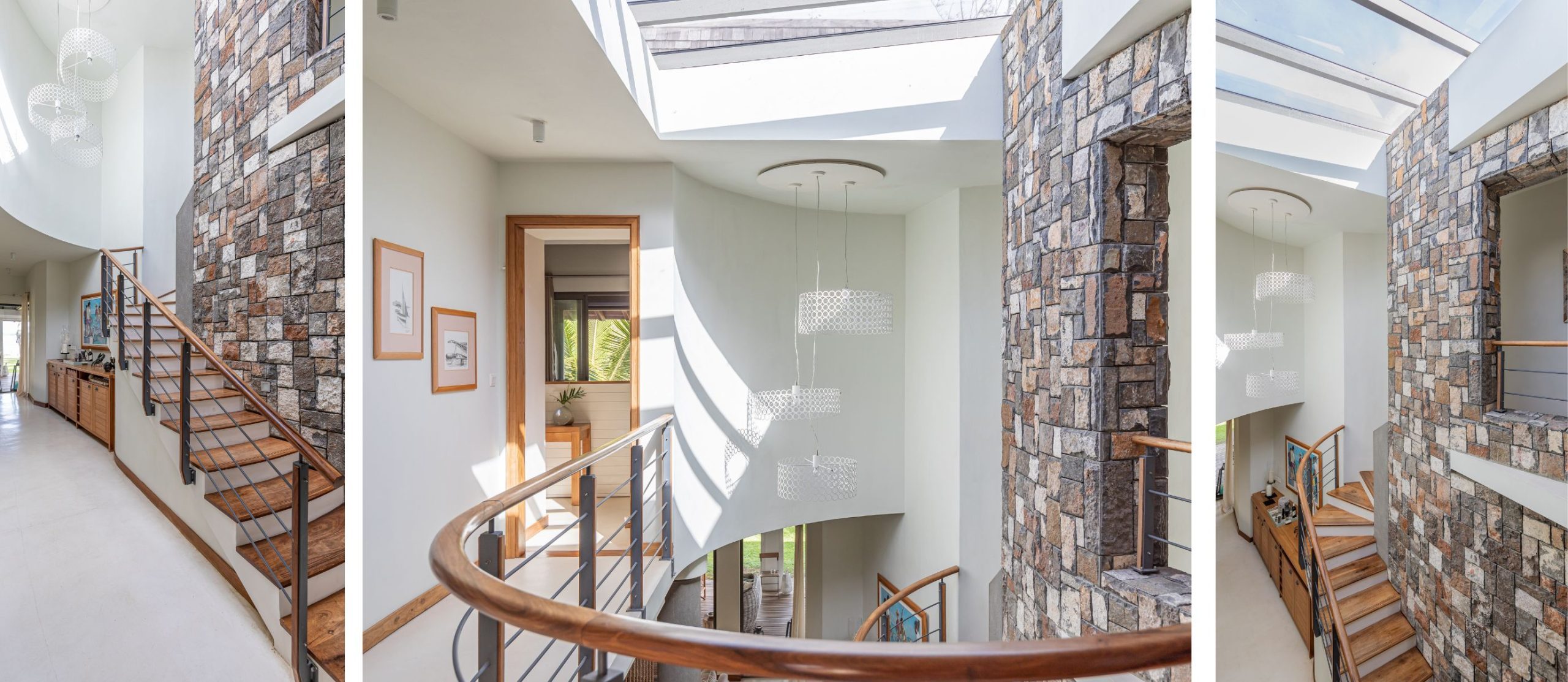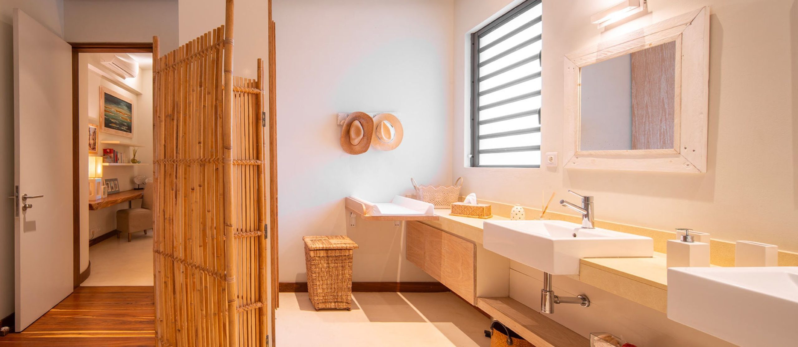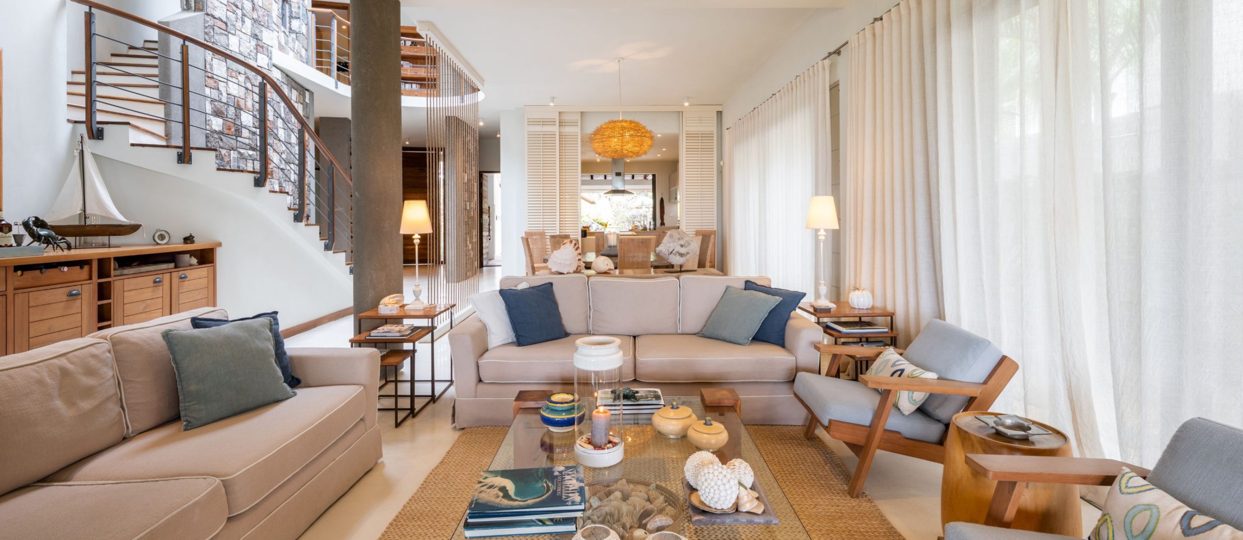 Designed by renowned architect Jean-François Adam, this contemporary five-bedroom villa exudes elegance and comfort in equal measure. The high-roof design and harmonious use of natural materials – wood, stone, and soft tropical hues – create a serene atmosphere, while its airy, welcoming interiors celebrate a marine-inspired palette and decor that evokes the rhythm of the Indian Ocean.