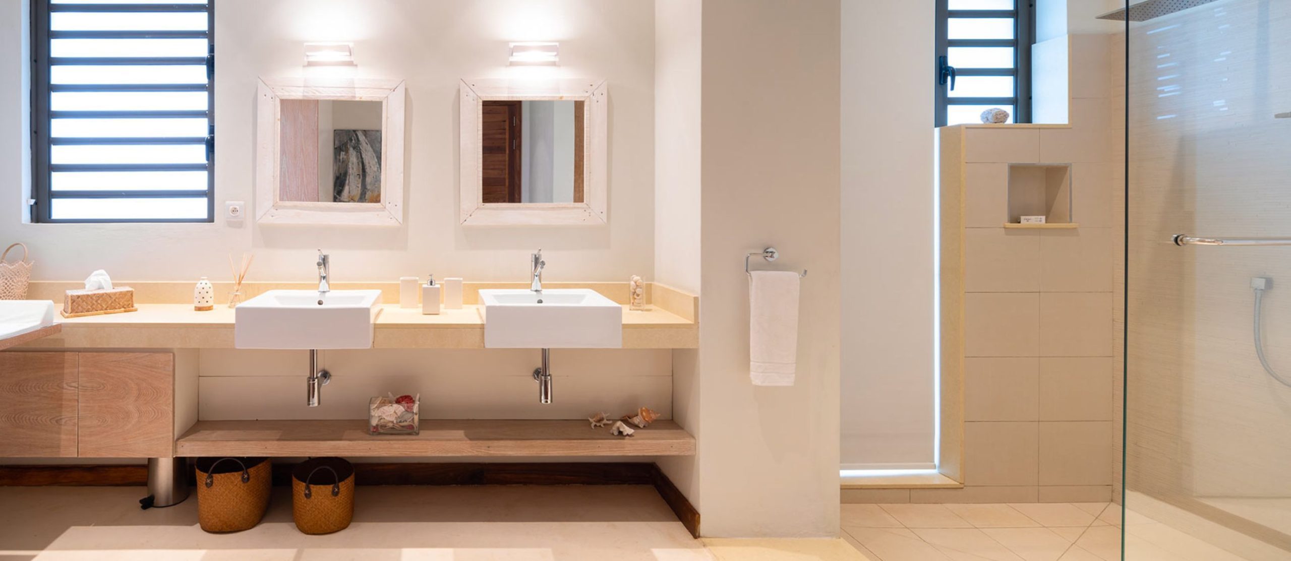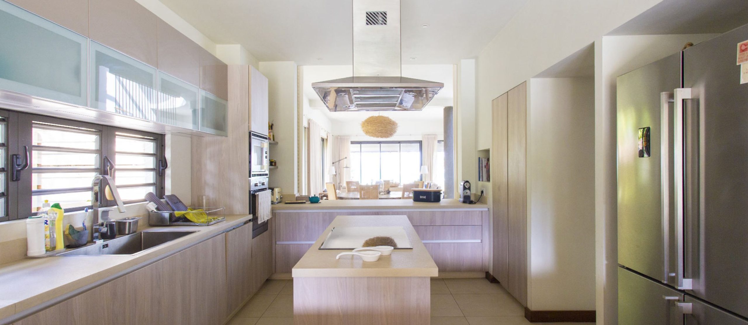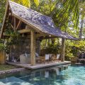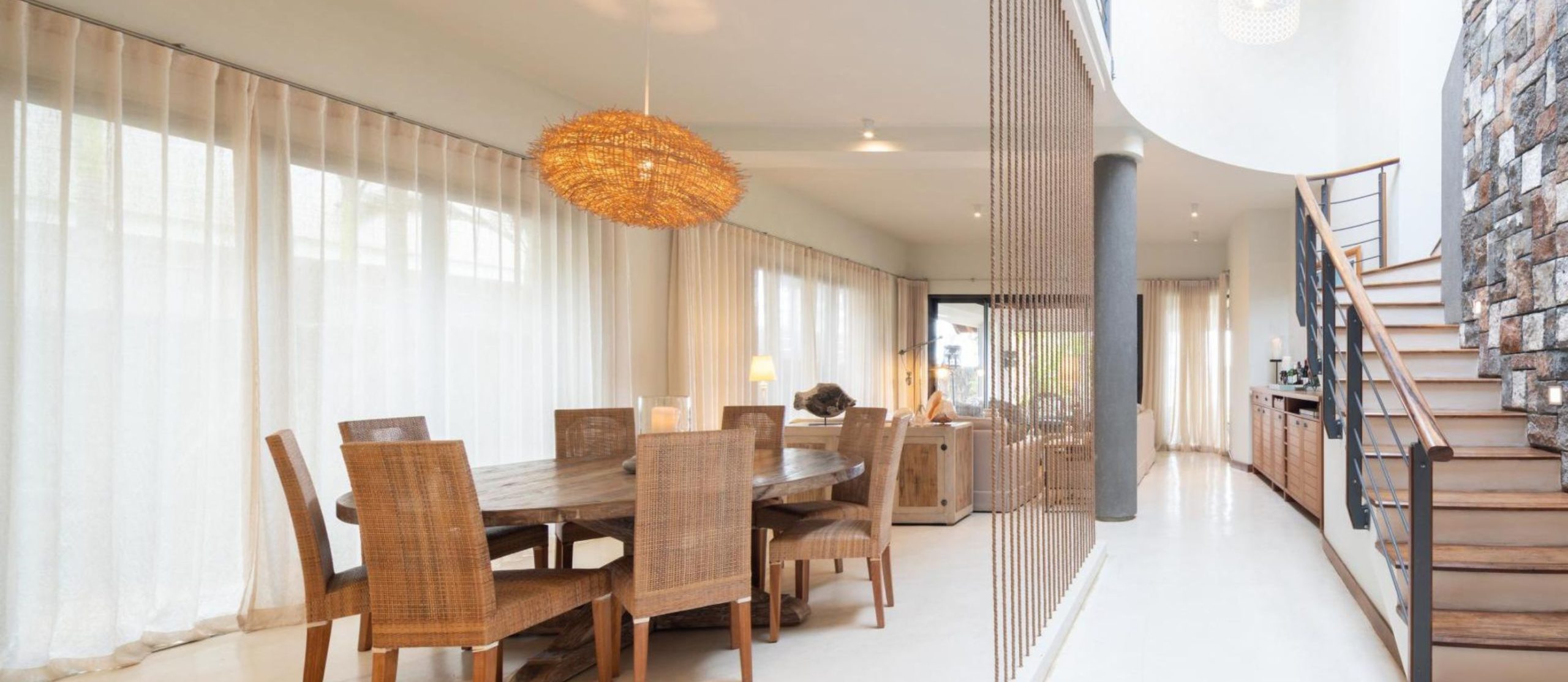 Designed by renowned architect Jean-François Adam, this contemporary five-bedroom villa exudes elegance and comfort in equal measure. The high-roof design and harmonious use of natural materials – wood, stone, and soft tropical hues – create a serene atmosphere, while its airy, welcoming interiors celebrate a marine-inspired palette and decor that evokes the rhythm of the Indian Ocean.