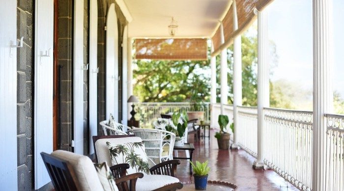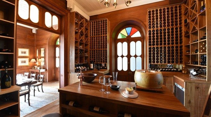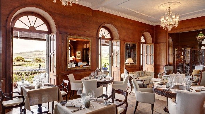 Renovated mansion house with antique furnishings, old paintings, high ceilings, oak panelled walls and a large veranda. Tables dressed in white linens, crystal glassware and candle lit